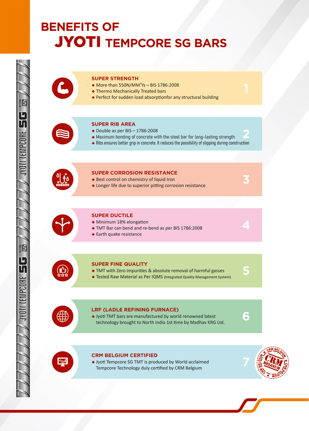 Our Flagships product JYOTI TEMPCORE SG REBARS is the result of a world class plant that follows stringent norms diligently all this to generate a sound trust and dependability in the minds of the structural designer of building. This results in building design which ensures savings thereby, promising more values to the customer